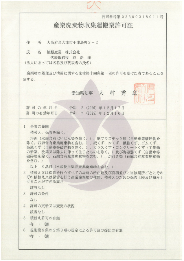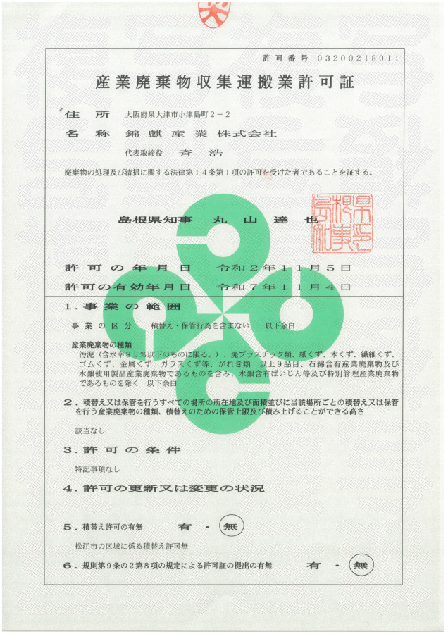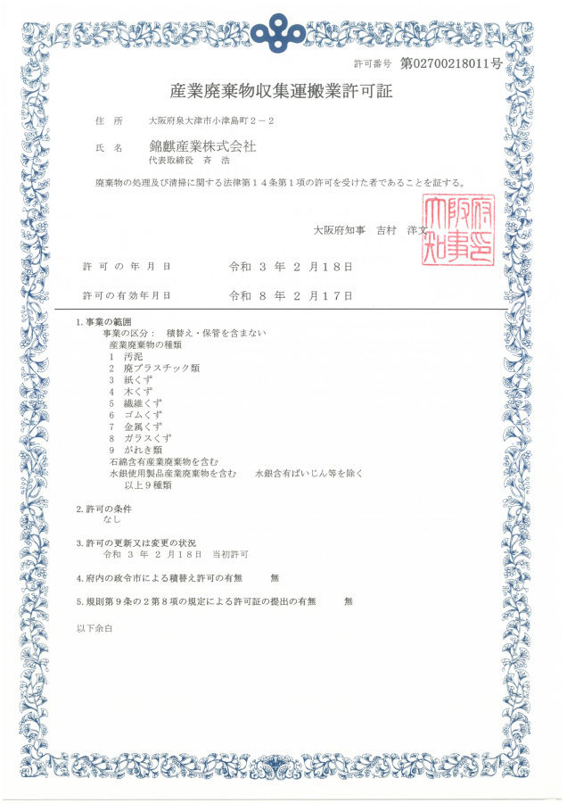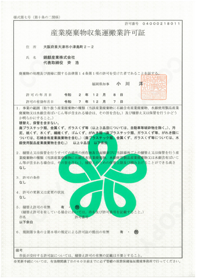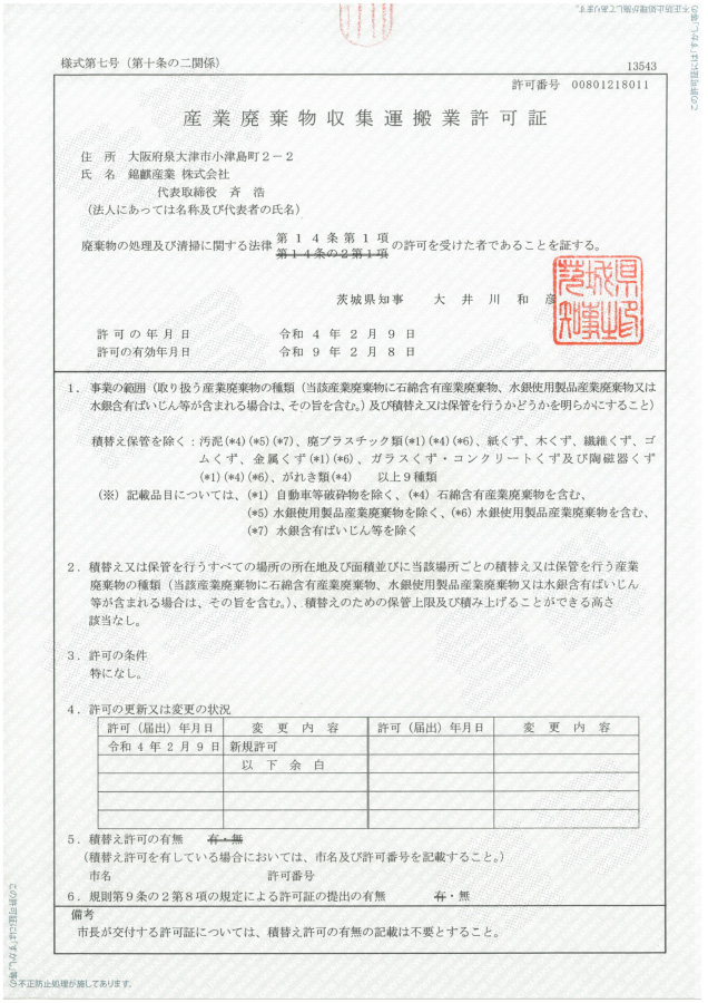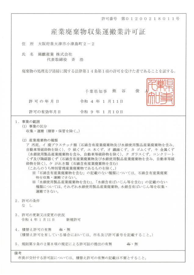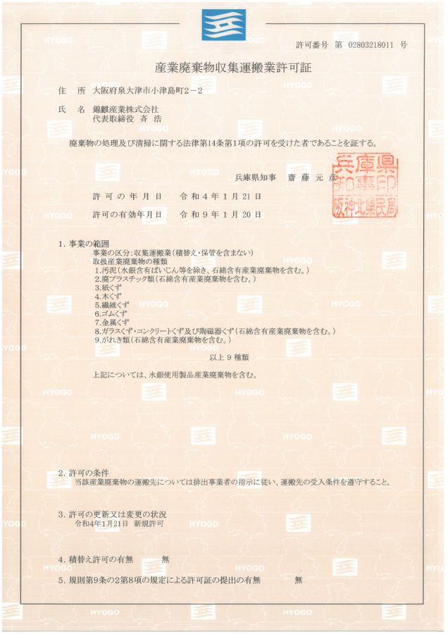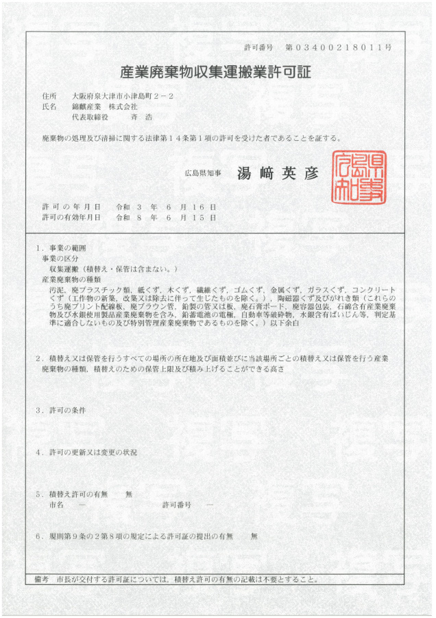 4250002539 廃油、廃酸、廃アルカリ、感染性産業廃棄物、廃石綿等 |