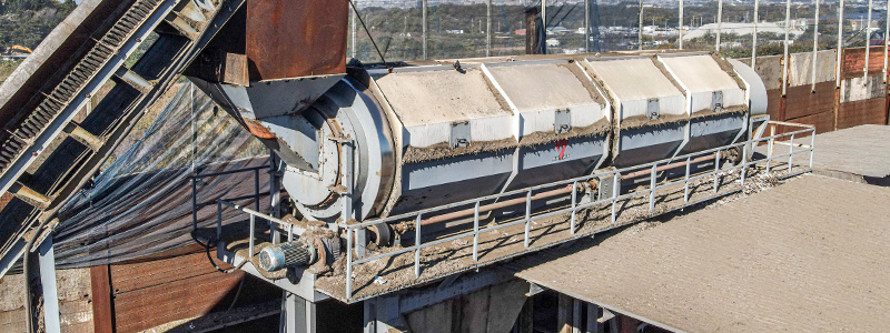 振動回転により不純物を取り除くトロンメル。穴が空いた回転式のドラムに投入された破砕物に回転と振動を与えることによって選別を行っています。