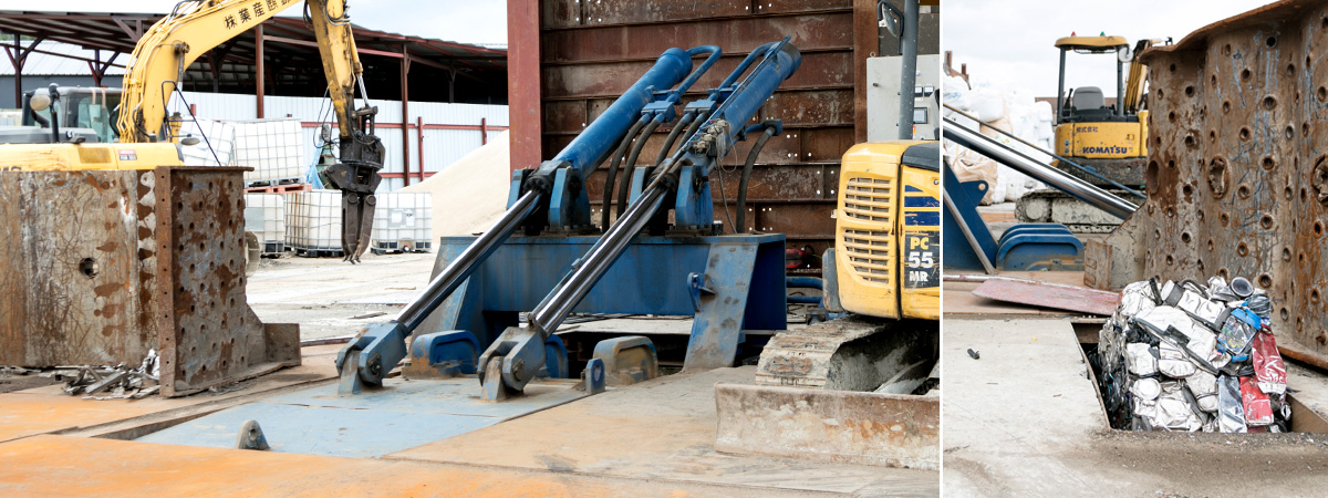 長尺のスクラップを切断するための大型設備です。H鋼などの鉄スクラップも一度に大量の切断加工が可能です。 和泉第一ヤードに1250tの富士車輌社製ギロチンシャーを設置しています。
